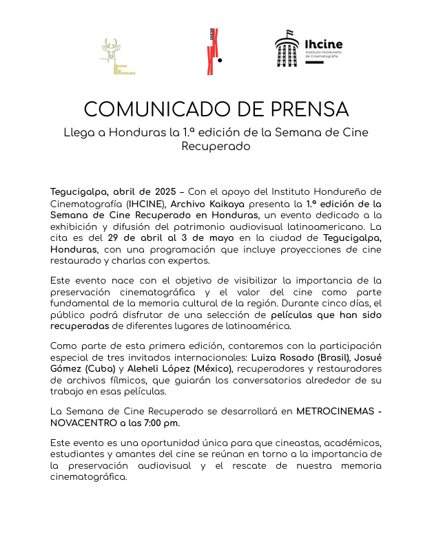 El Instituto Hondureño de Cinematografìa (IHCINE) y @archivo.kaikaya , tienen el agrado de invitarles a ser parte de la 1ra edición de la Semana de Cine Recuperado, un espacio dedicado a la exhibición y difusión del patrimonio audiovisual latinoamericano, en el cual exploraremos el valor del cine restaurado a través de proyecciones y charlas con expertos en conservación audiovisual.