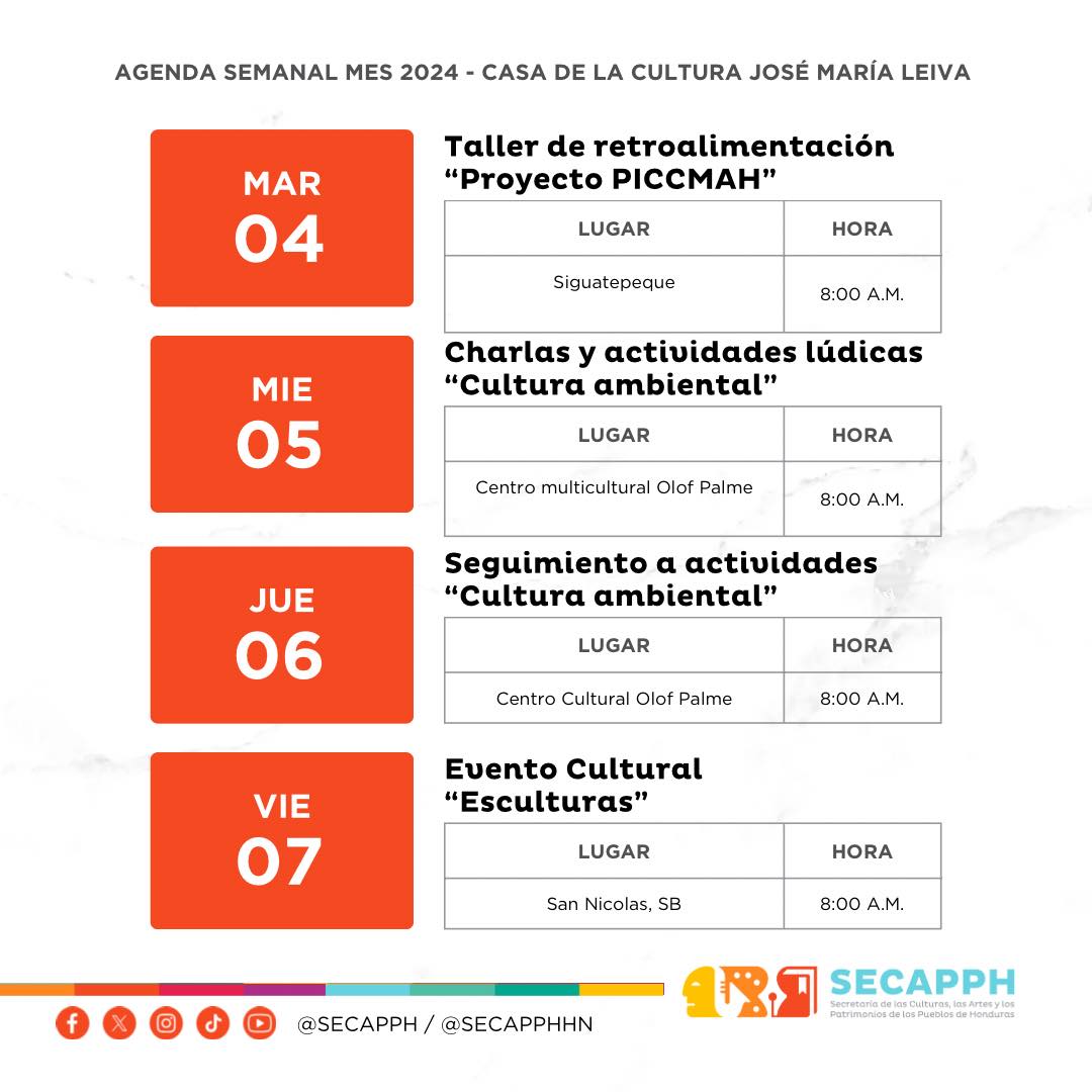 Te compartimos la agenda de actividades de nuestra Casa de la Cultura José María Leiva Vivas en Santa Bárbara. Ven y disfruta de eventos culturales únicos y enriquecedores.