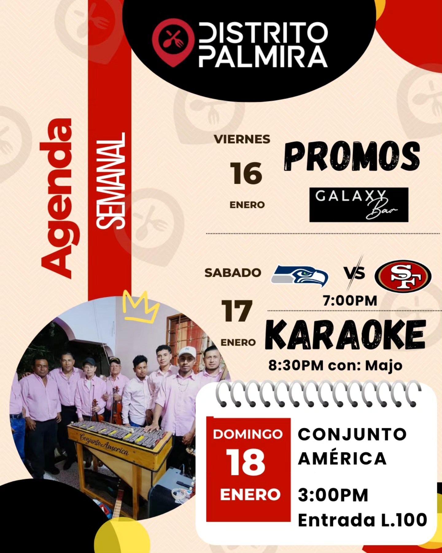 Agenda semanal: Distrito Palmira Fecha de Inicio Viernes, Enero 16, 2026 - 07:00 PM Sábado, Enero 17, 2026 - 07:00 PM Domingo, Enero 18, 2026 - 03:00 PM Entretenimiento y Medios Esta semana la agenda de Distrito Palmira viene con todo...Promociones, Partido, Karaoke y pasta cerrar Conjunto América. Te esperamos con el mejor ambiente de la ciudad