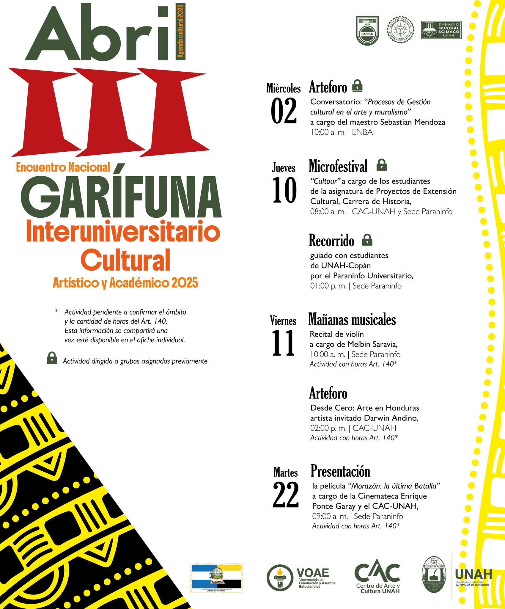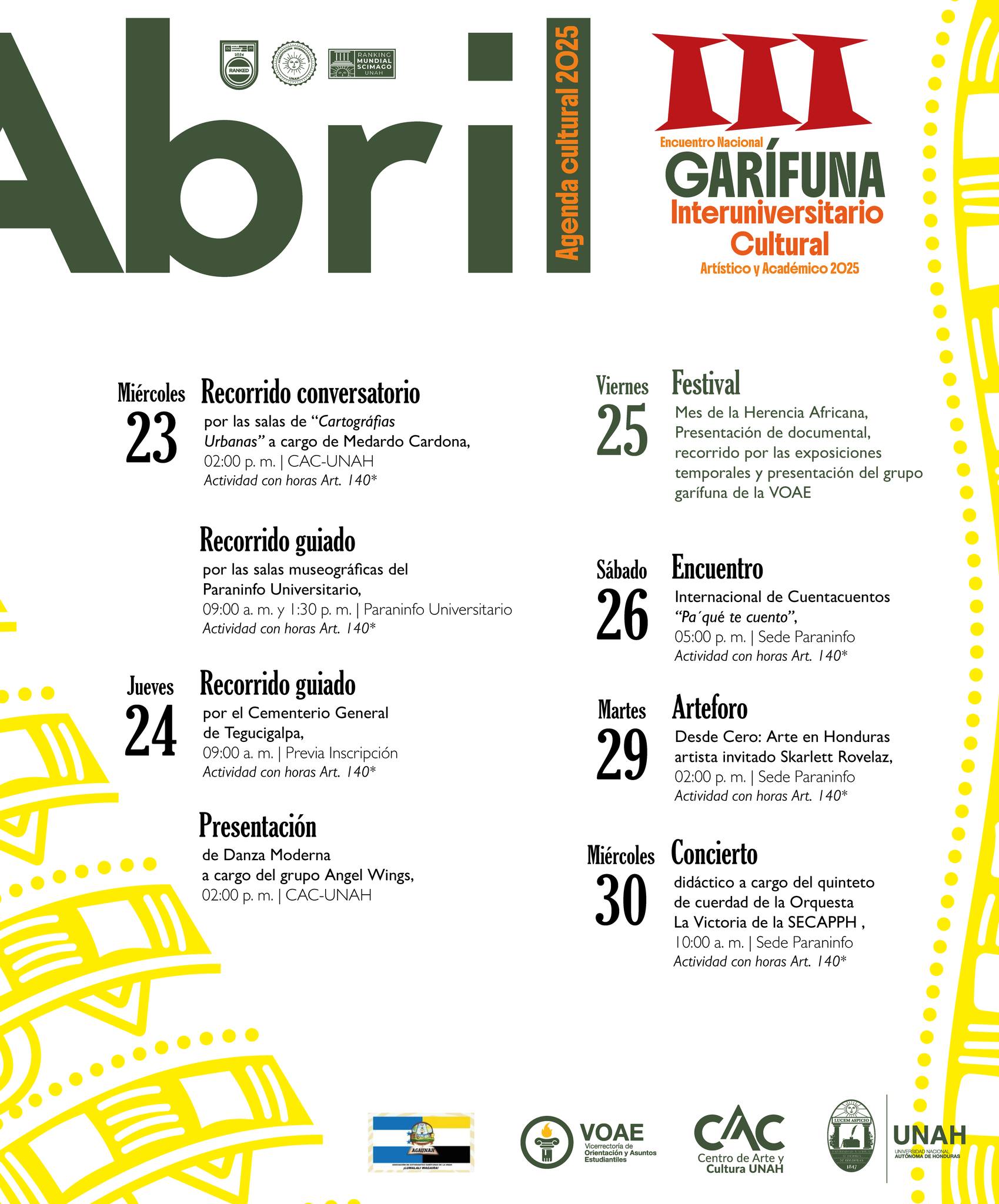 Además, el viernes 25 de abril, nos sumamos al III Encuentro Nacional Artístico y Académico Interuniversitario Garífuna, con una actividad especial en la sede del Paraninfo Universitario, que incluye: