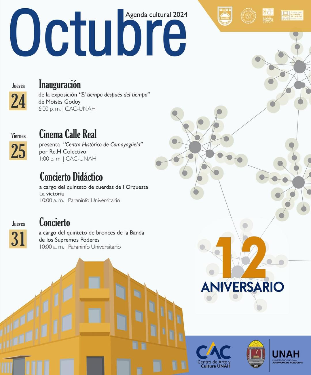 Presentamos la Agenda Cultural de #Octubre2024 y celebramos nuestro 12vo aniversario promoviendo arte y cultura en el CAC-UNAH.