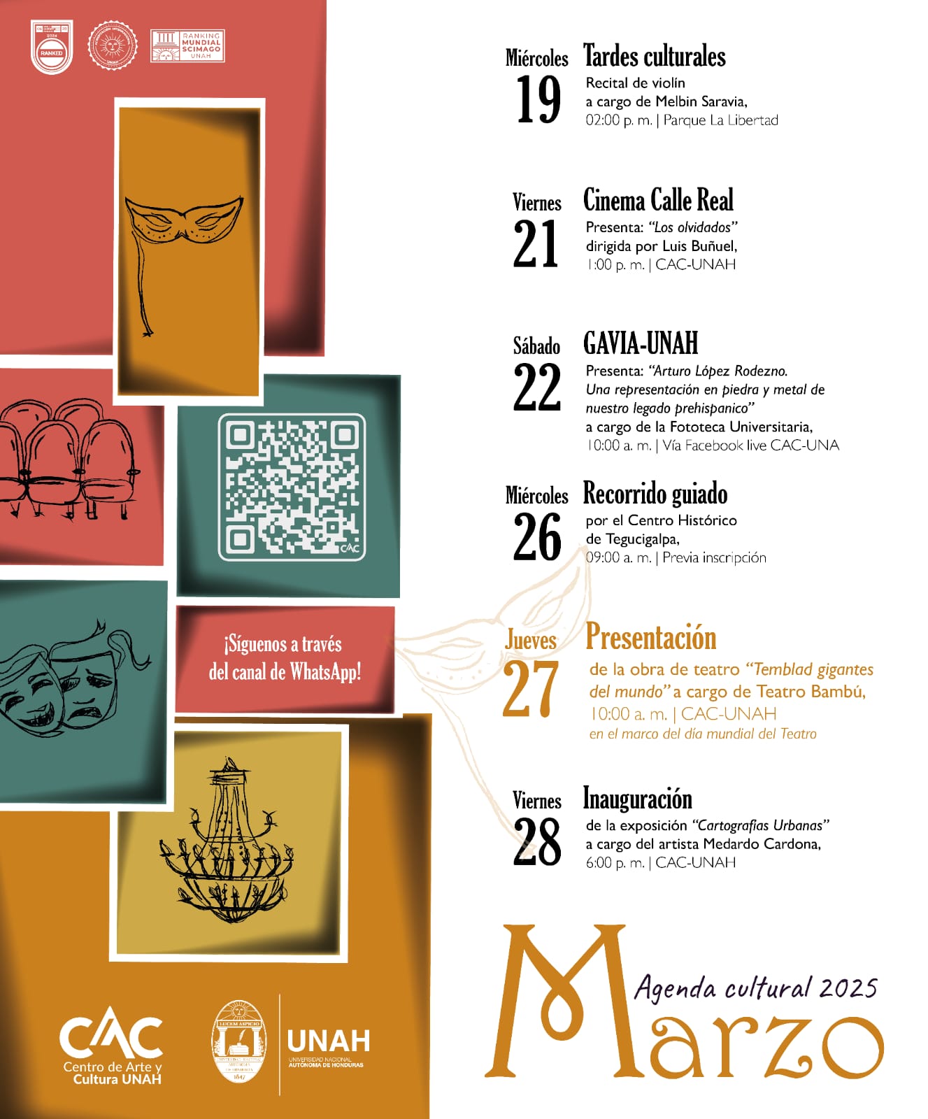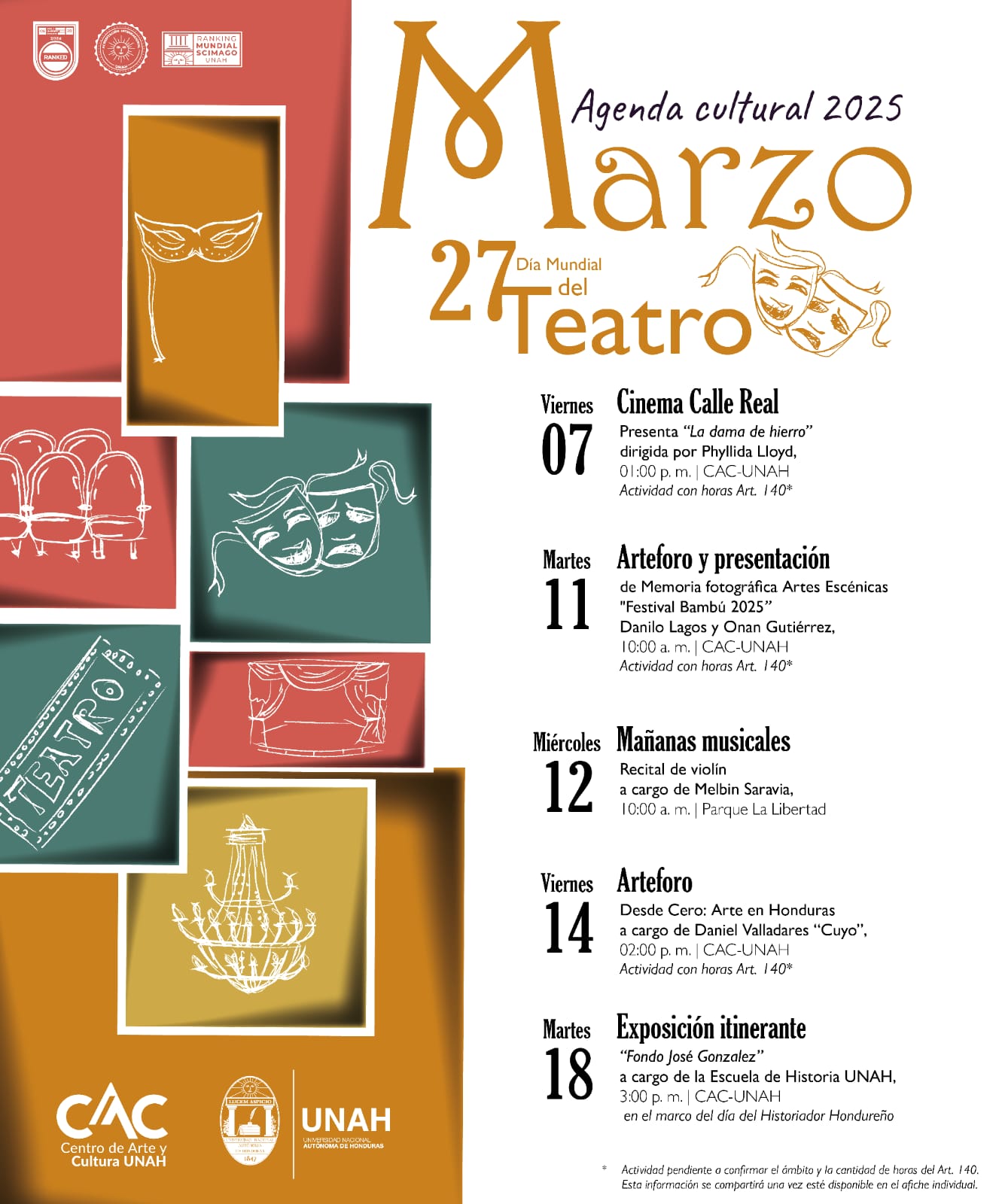 CAC UNAH: Agenda Cultural marzo 2025 Fecha de Inicio Viernes, Marzo 7, 2025 - 12:00 AM Martes, Marzo 11, 2025 - 12:00 AM Miércoles, Marzo 12, 2025 - 12:00 AM Viernes, Marzo 14, 2025 - 12:00 AM Martes, Marzo 18, 2025 - 12:00 AM Miércoles, Marzo 19, 2025 - 12:00 AM Viernes, Marzo 21, 2025 - 12:00 AM Sábado, Marzo 22, 2025 - 12:00 AM Miércoles, Marzo 26, 2025 - 12:00 AM Jueves, Marzo 27, 2025 - 12:00 AM Viernes, Marzo 28, 2025 - 12:00 AM Arte CAC UNAH: Agenda Cultural marzo 2025