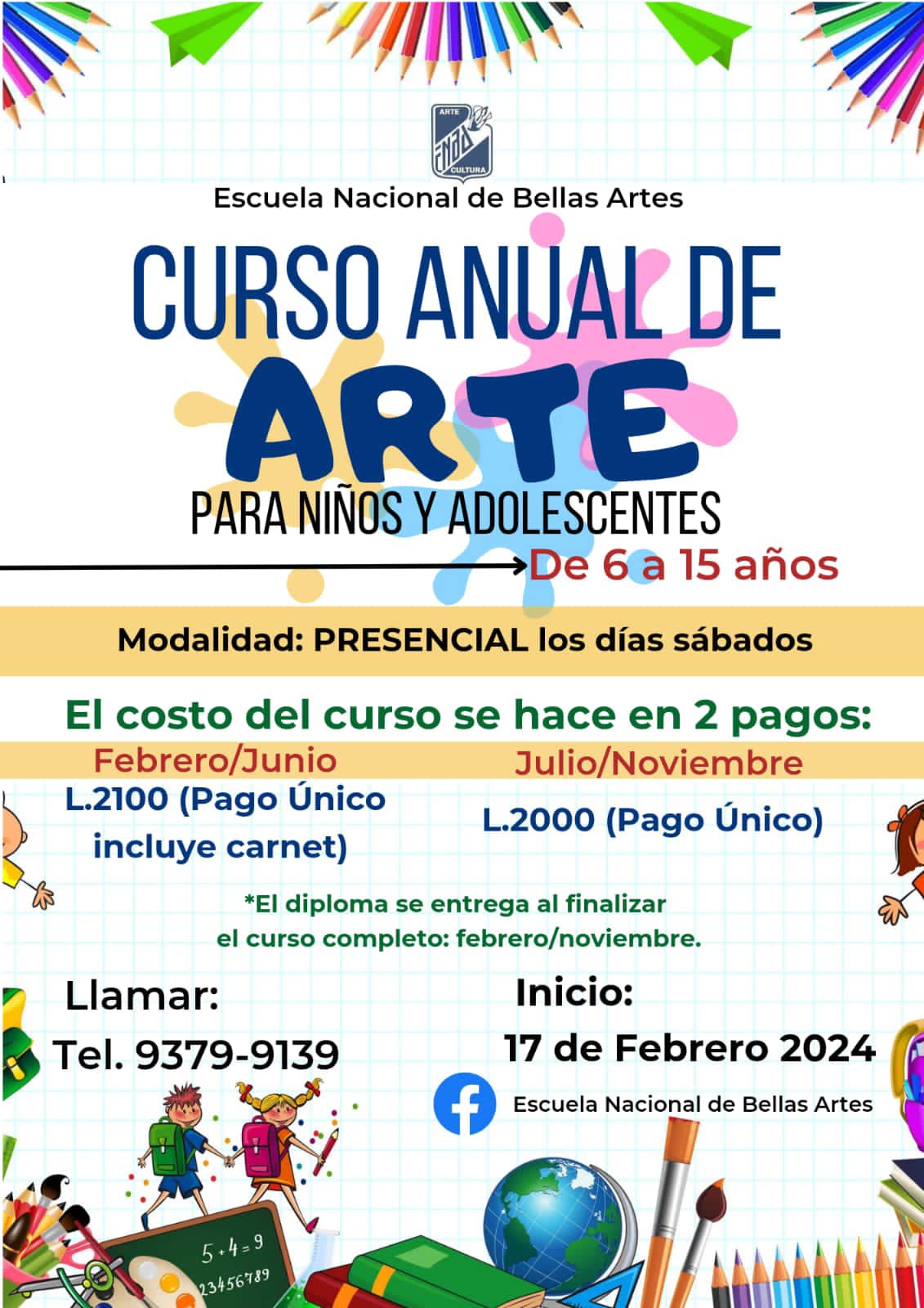 Cursos libres de arte 2024. Fecha de Inicio Sábado, Febrero 17, 2024 - 12:00 AM Educación y Formación Les invitamos a nuestros cursos libres de arte 2024. Ubicación: Escuela Nacional de Bellas Artes , enfrente de parque Libertad, calle real Comayagüela
