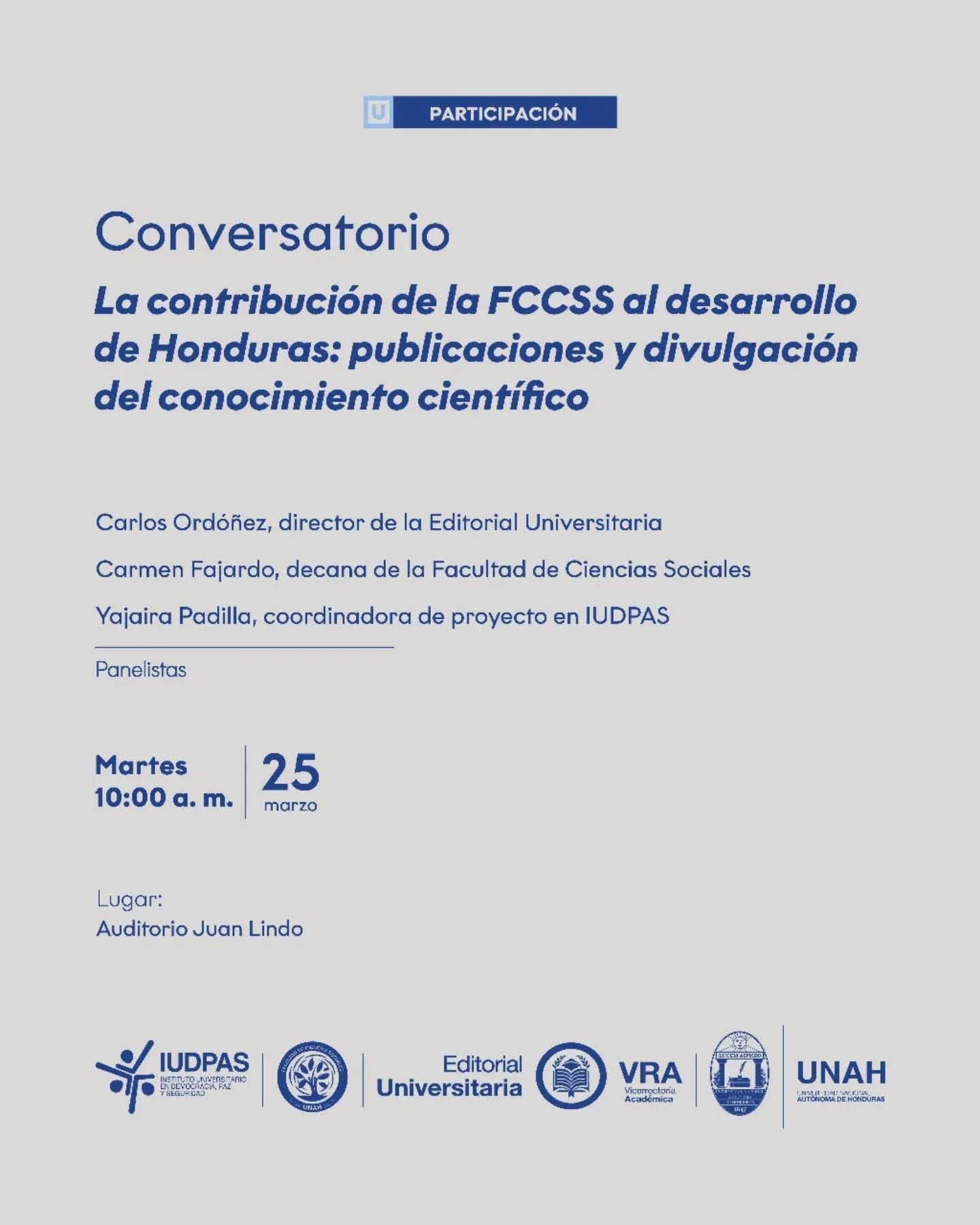 Este martes 25 de marzo acompañanos en el Auditorio Juan Lindo a ser parte de la Feria de Publicaciones de la Facultad de Ciencias Sociales 2025 y del conversatorio «La contribución de la FCCSS al desarrollo de Honduras: publicaciones y divulgación del conocimiento científico».