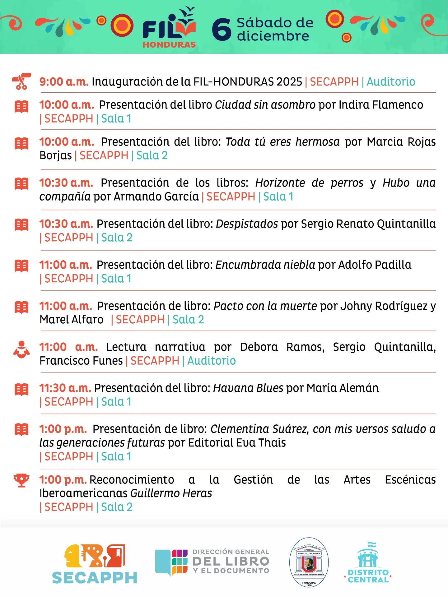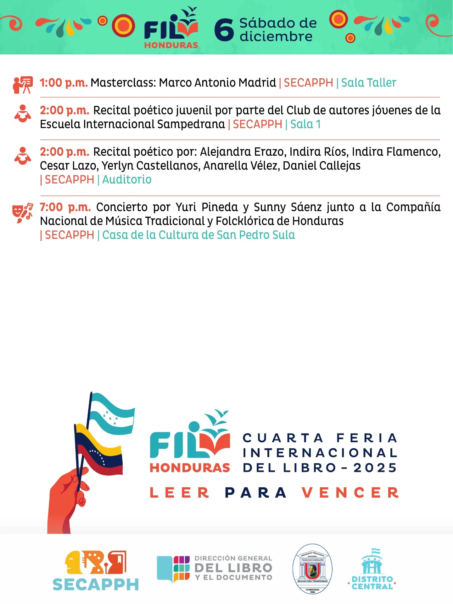 Agenda el sábado, 6 de diciembre, y las horas de las actividades que llamen tu atención y acompañanos en esta IV edición en la biblioteca de la Universidad Pedagógica Nacional Francisco Morazán de San Pedro Sula. 🏫