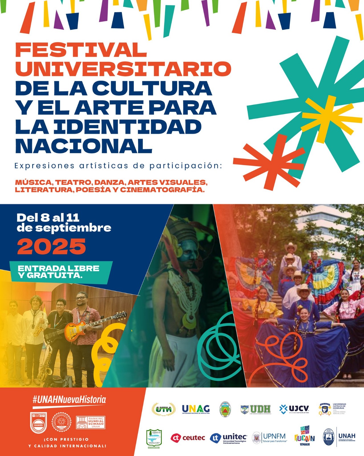 Festival Universitario de la Cultura y el Arte para la Identidad Nacional Fecha de Inicio Lunes, Septiembre 8, 2025 - 12:00 AM Martes, Septiembre 9, 2025 - 12:00 AM Miércoles, Septiembre 10, 2025 - 12:00 AM Jueves, Septiembre 11, 2025 - 12:00 AM Arte Festival Universitario de la Cultura y el Arte para la Identidad Nacional