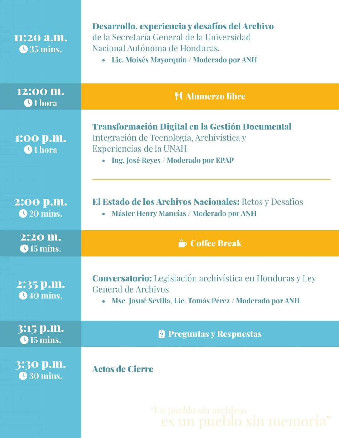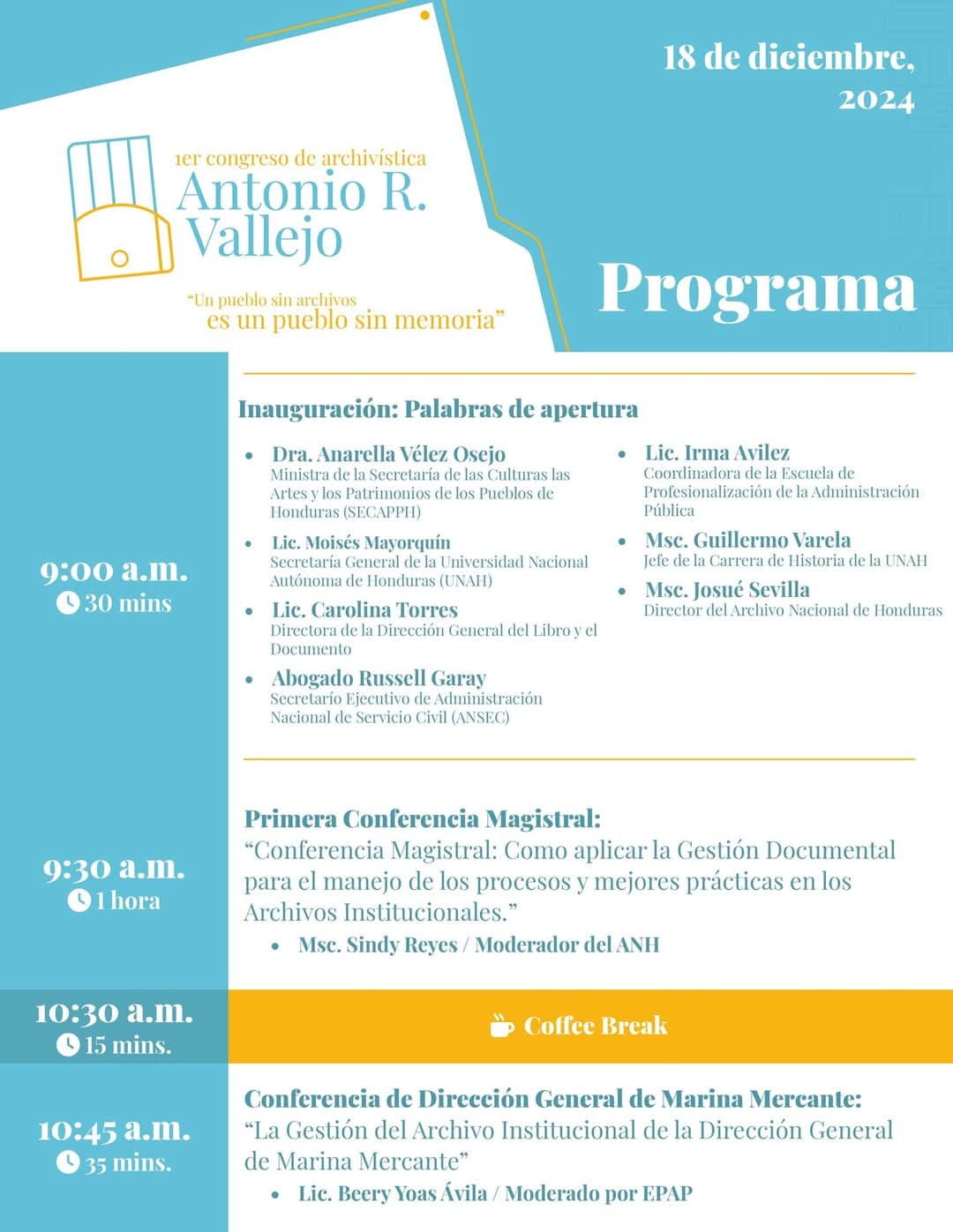 les espera una jornada cargada de conocimiento archivístico de la mano de personal calificado. En el Primer Congreso de Archivística "Antonio Ramón Vallejo" habrán numerosas conferencias y ponencias destinadas a relatar la importancia de la Archivística en la administración, la transparencia y el combate a la corrupción. A su vez se enseñará a como implementar las técnicas correctas de conservación y gestión de archivos. Finalmente dará apertura de espacios de discusión y debate en torno al marco legal de la archivística en el país ![]()