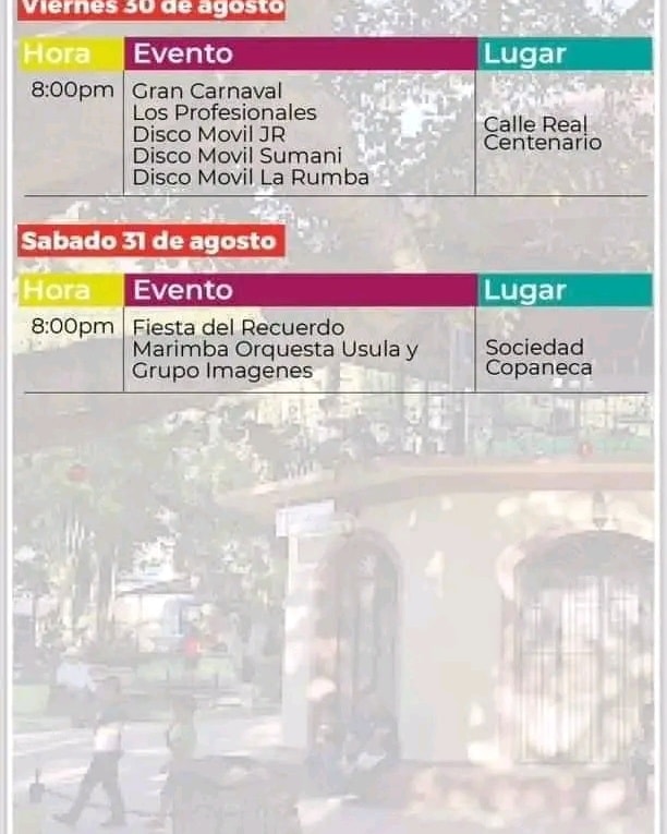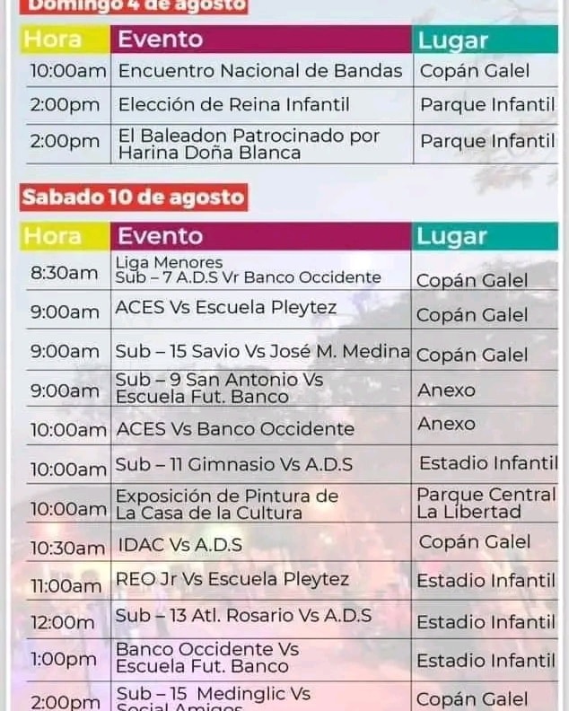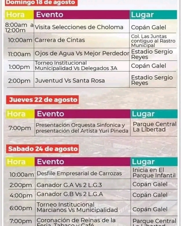 Programación de la feria de Santa Rosa de Copán Fecha de Inicio Viernes, Agosto 2, 2024 - 12:00 AM Sábado, Agosto 3, 2024 - 12:00 AM Domingo, Agosto 4, 2024 - 12:00 AM Sábado, Agosto 10, 2024 - 12:00 AM Domingo, Agosto 11, 2024 - 12:00 AM Martes, Agosto 13, 2024 - 12:00 AM Miércoles, Agosto 14, 2024 - 12:00 AM Jueves, Agosto 15, 2024 - 12:00 AM Viernes, Agosto 16, 2024 - 12:00 AM Sábado, Agosto 17, 2024 - 12:00 AM Domingo, Agosto 18, 2024 - 12:00 AM Jueves, Agosto 22, 2024 - 12:00 AM Sábado, Agosto 24, 2024 - 12:00 AM Domingo, Agosto 25, 2024 - 12:00 AM Martes, Agosto 27, 2024 - 12:00 AM Jueves, Agosto 29, 2024 - 12:00 AM Viernes, Agosto 30, 2024 - 12:00 AM Sábado, Agosto 31, 2024 - 12:00 AM Cultura y Patrimonio Les compartimos la programación de la feria de Santa Rosa de Copán para que puedas disfrutar con tu familia.