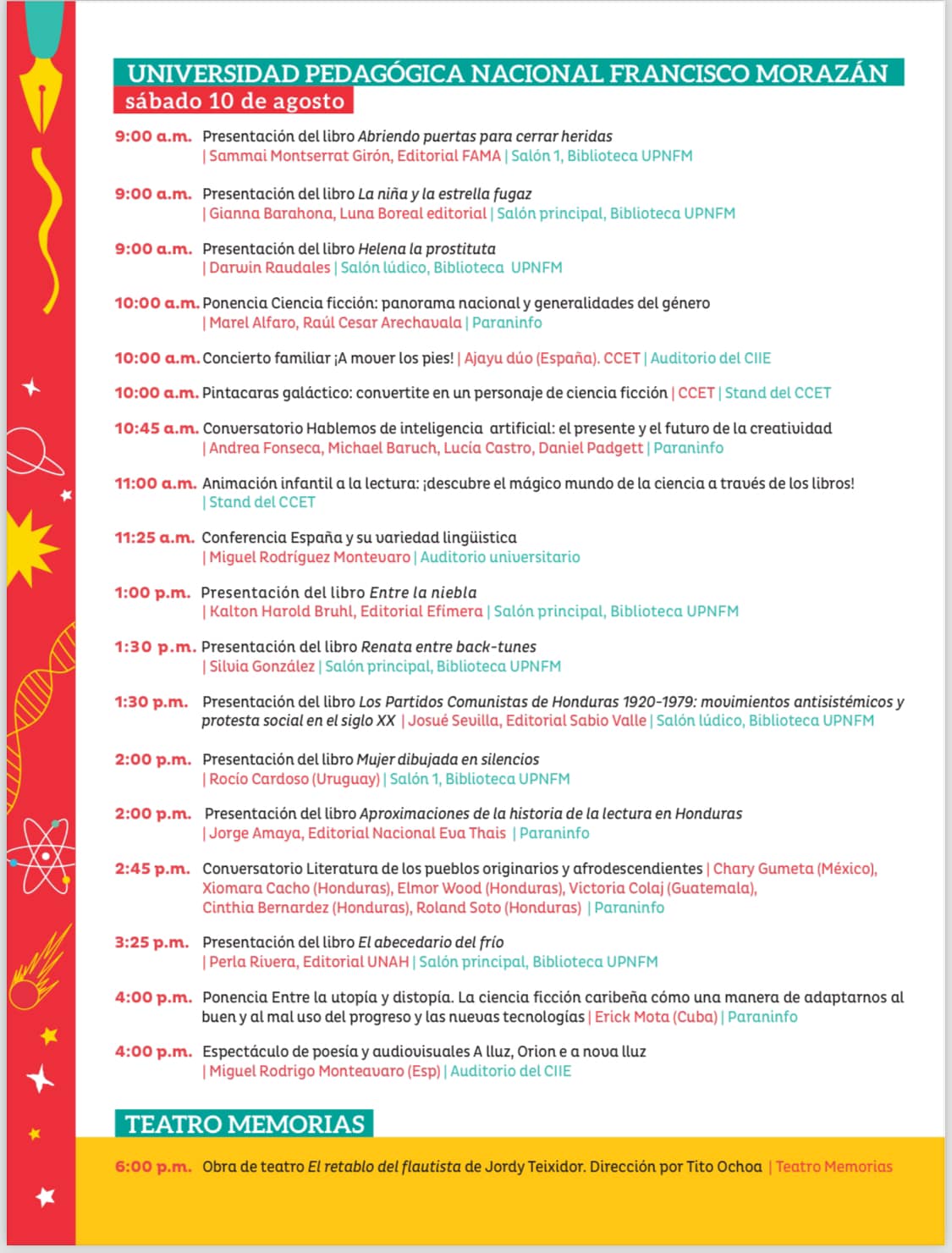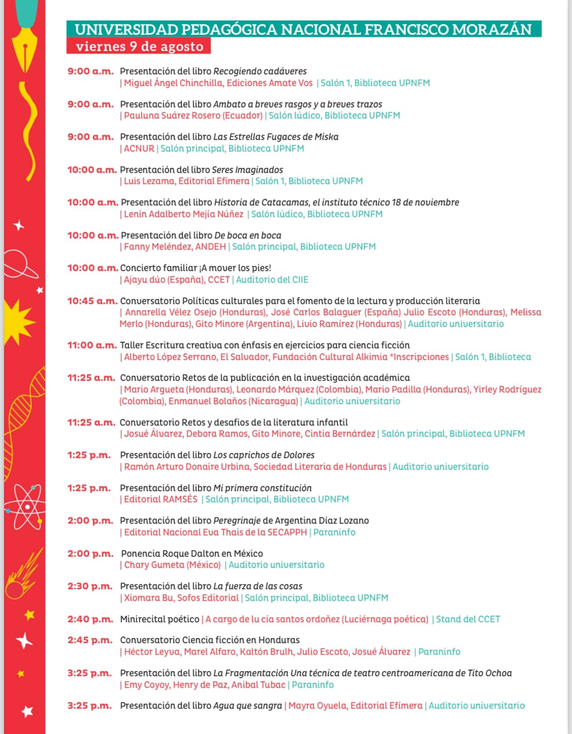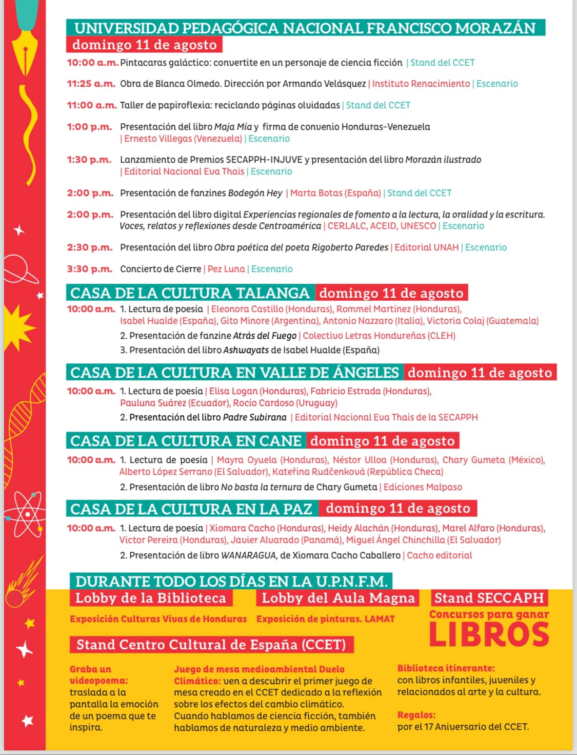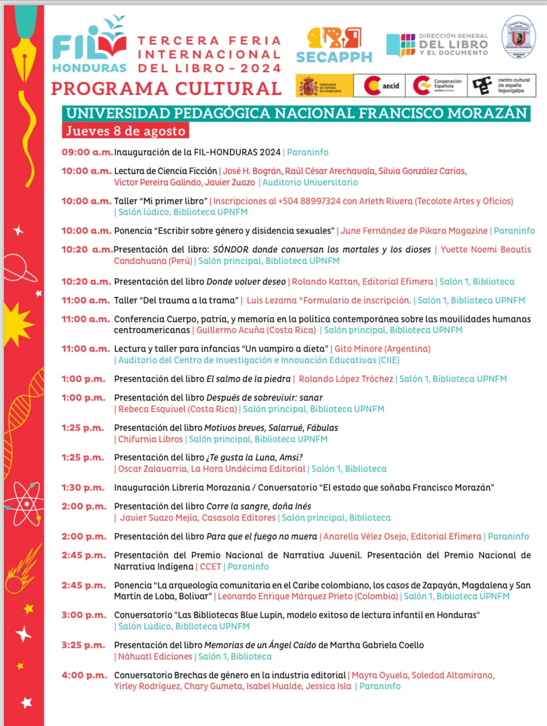 Programación de la tercera Feria Internacional del Libro Honduras del 8 al 11 de agosto 2024, con el lema, Que la Lectura nos Acompañe, este año dedicada a la Cuencia Ficción, país invitado de honor España