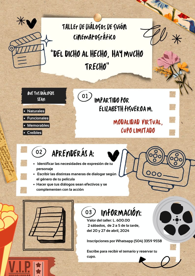 Taller de Diálogos de Guion Cinematográfico Fecha de Inicio Lunes, Abril 15, 2024 - 12:00 AM Jueves, Abril 18, 2024 - 12:00 AM Educación y Formación Taller de Diálogos de Guion Cinematográfico