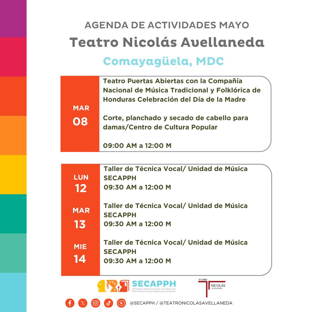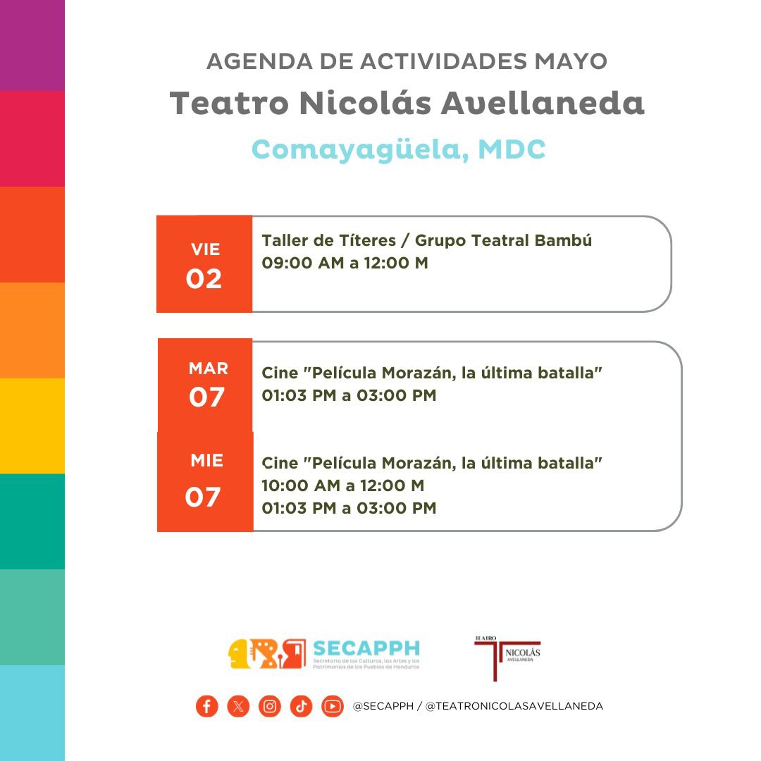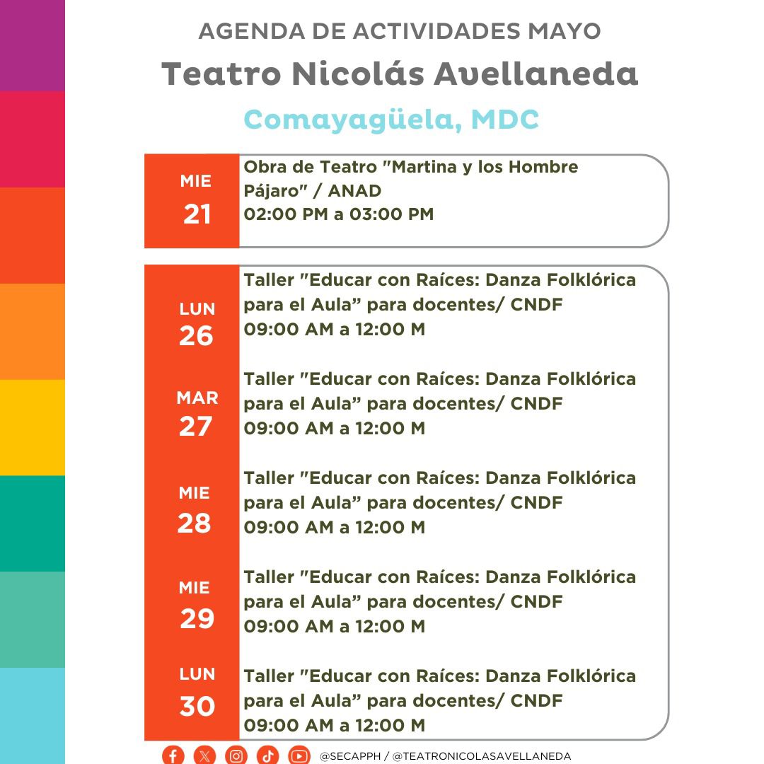 Teatro Nicolás Avellaneda: Agenda de Actividades del mes de mayo Fecha de Inicio Viernes, Mayo 2, 2025 - 12:00 AM Miércoles, Mayo 7, 2025 - 12:00 AM Jueves, Mayo 8, 2025 - 12:00 AM Lunes, Mayo 12, 2025 - 12:00 AM Martes, Mayo 13, 2025 - 12:00 AM Miércoles, Mayo 14, 2025 - 12:00 AM Miércoles, Mayo 21, 2025 - 12:00 AM Lunes, Mayo 26, 2025 - 12:00 AM Martes, Mayo 27, 2025 - 12:00 AM Miércoles, Mayo 28, 2025 - 12:00 AM Jueves, Mayo 29, 2025 - 12:00 AM Viernes, Mayo 30, 2025 - 12:00 AM Arte Teatro Nicolás Avellaneda: Agenda de Actividades del mes de mayo
