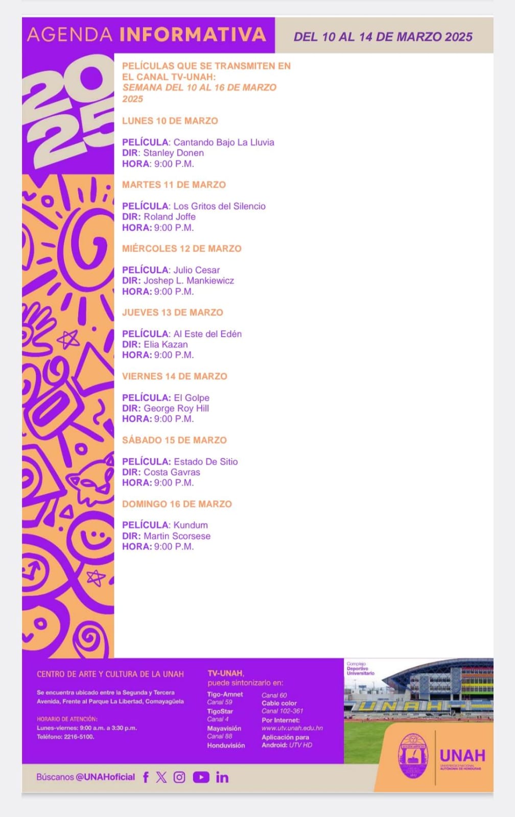 UNAH: Agenda Informativa 10 -14 marzo 2025 Fecha de Inicio Lunes, Marzo 10, 2025 - 12:00 AM Martes, Marzo 11, 2025 - 12:00 AM Miércoles, Marzo 12, 2025 - 12:00 AM Jueves, Marzo 13, 2025 - 12:00 AM Viernes, Marzo 14, 2025 - 12:00 AM Conferencia de prensa UNAH: Agenda Informativa 10 -14 marzo 2025