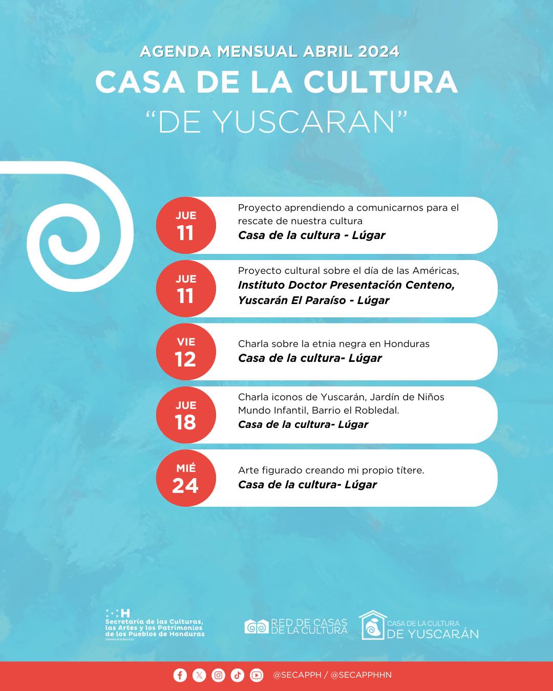 Les compartimos la agenda de actividades de nuestra Casa de la Cultura de Danlí y de nuestra Casa de la Cultura de Yuscuran.