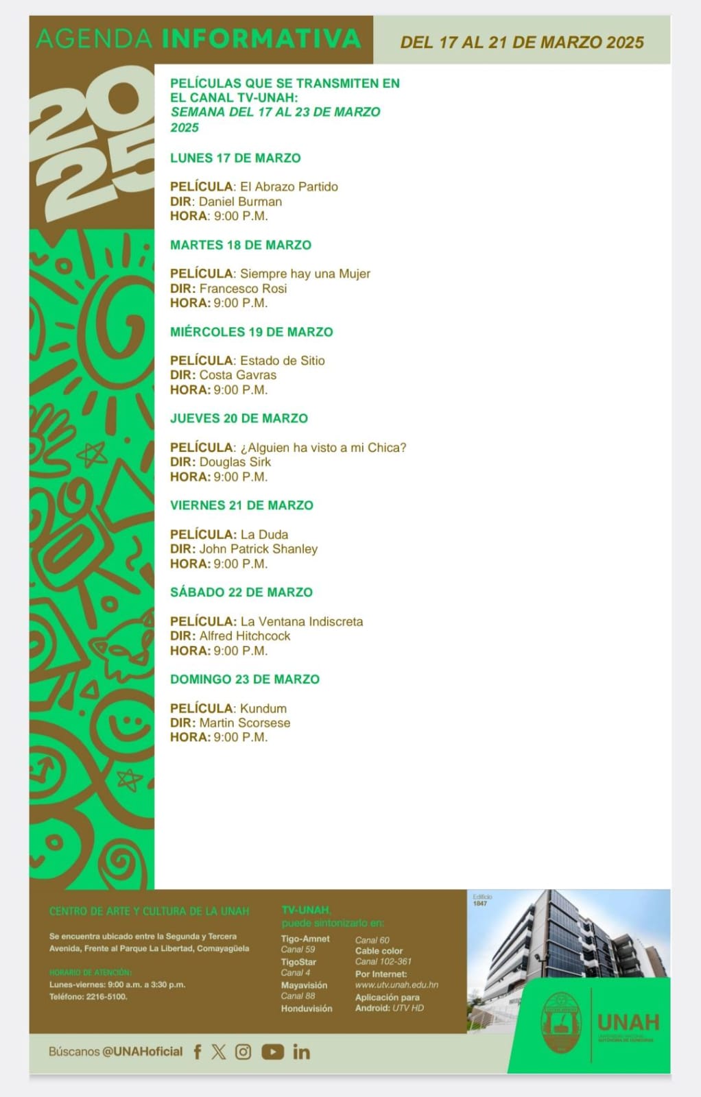 Agenda UNAH Fecha de Inicio Lunes, Marzo 17, 2025 - 12:00 AM Martes, Marzo 18, 2025 - 12:00 AM Miércoles, Marzo 19, 2025 - 12:00 AM Jueves, Marzo 20, 2025 - 12:00 AM Viernes, Marzo 21, 2025 - 12:00 AM Conferencia de prensa Agenda UNAH