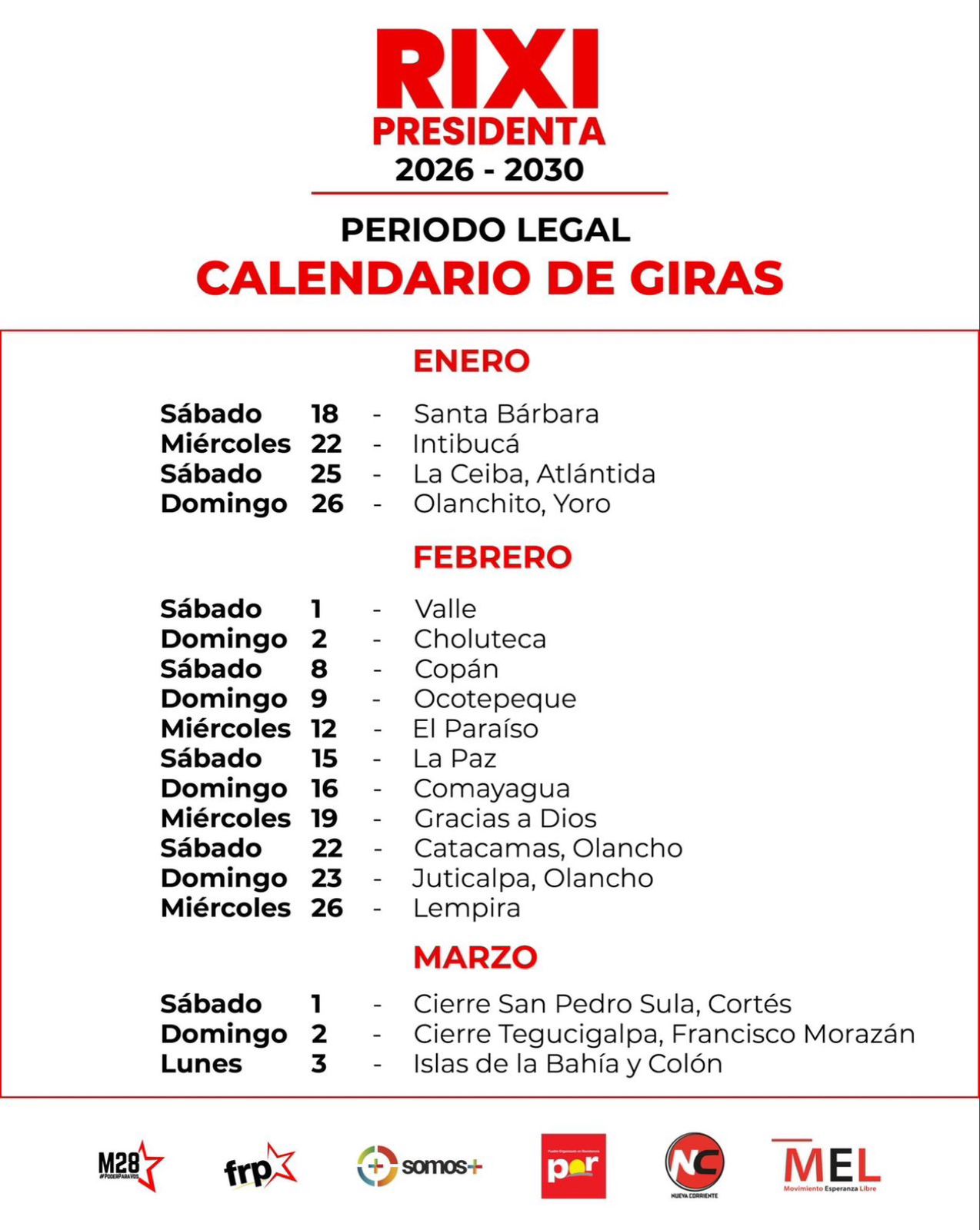 Calendario de Giras – Rixi Moncada Fecha de Inicio Sábado, Enero 18, 2025 - 12:00 AM Miércoles, Enero 22, 2025 - 12:00 AM Sábado, Enero 25, 2025 - 12:00 AM Domingo, Enero 26, 2025 - 12:00 AM Sábado, Febrero 1, 2025 - 12:00 AM Domingo, Febrero 2, 2025 - 12:00 AM Sábado, Febrero 8, 2025 - 12:00 AM Domingo, Febrero 9, 2025 - 12:00 AM Miércoles, Febrero 12, 2025 - 12:00 AM Sábado, Febrero 15, 2025 - 12:00 AM Domingo, Febrero 16, 2025 - 12:00 AM Miércoles, Febrero 19, 2025 - 12:00 AM Sábado, Febrero 22, 2025 - 12:00 AM Domingo, Febrero 23, 2025 - 12:00 AM Domingo, Febrero 23, 2025 - 12:00 AM Miércoles, Febrero 26, 2025 - 12:00 AM Sábado, Marzo 1, 2025 - 12:00 AM Domingo, Marzo 2, 2025 - 12:00 AM Lunes, Marzo 3, 2025 - 12:00 AM Conferencia de prensa Calendario de Giras – Rixi Moncada