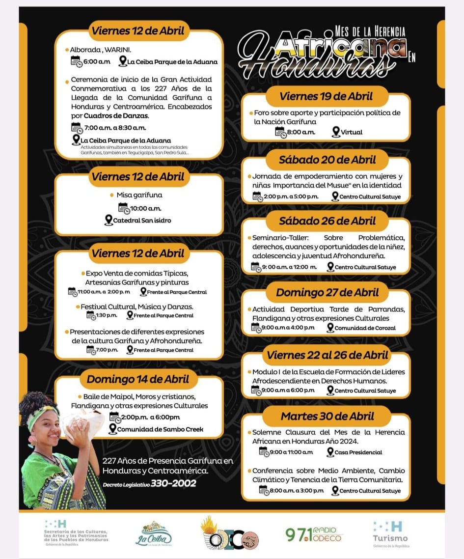 Calendario del Mes de la Herencia Africana en Honduras Fecha de Inicio Lunes, Abril 1, 2024 - 07:00 AM Viernes, Abril 5, 2024 - 08:00 AM Sábado, Abril 6, 2024 - 10:00 AM Lunes, Abril 8, 2024 - 08:00 AM Viernes, Abril 12, 2024 - 06:00 AM Viernes, Abril 19, 2024 - 08:00 AM Viernes, Abril 26, 2024 - 09:00 AM Martes, Abril 30, 2024 - 09:00 AM Cultura y Patrimonio Calendario del Mes de la Herencia Africana en Honduras.227 Años de Presencia Garifuna en Honduras y Centroamérica.