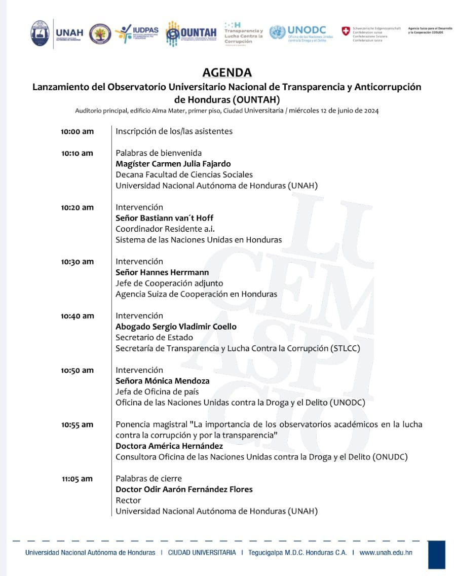 Lanzamiento del Observatorio Universitario Nacional de Transparencia y Anticorrupción de Honduras, el evento es de 10am y 12m en el edificio Alma Mater, estará el rector Odir Fernández, la decana de Ciencias Sociales, Carmen Julia Fajardo