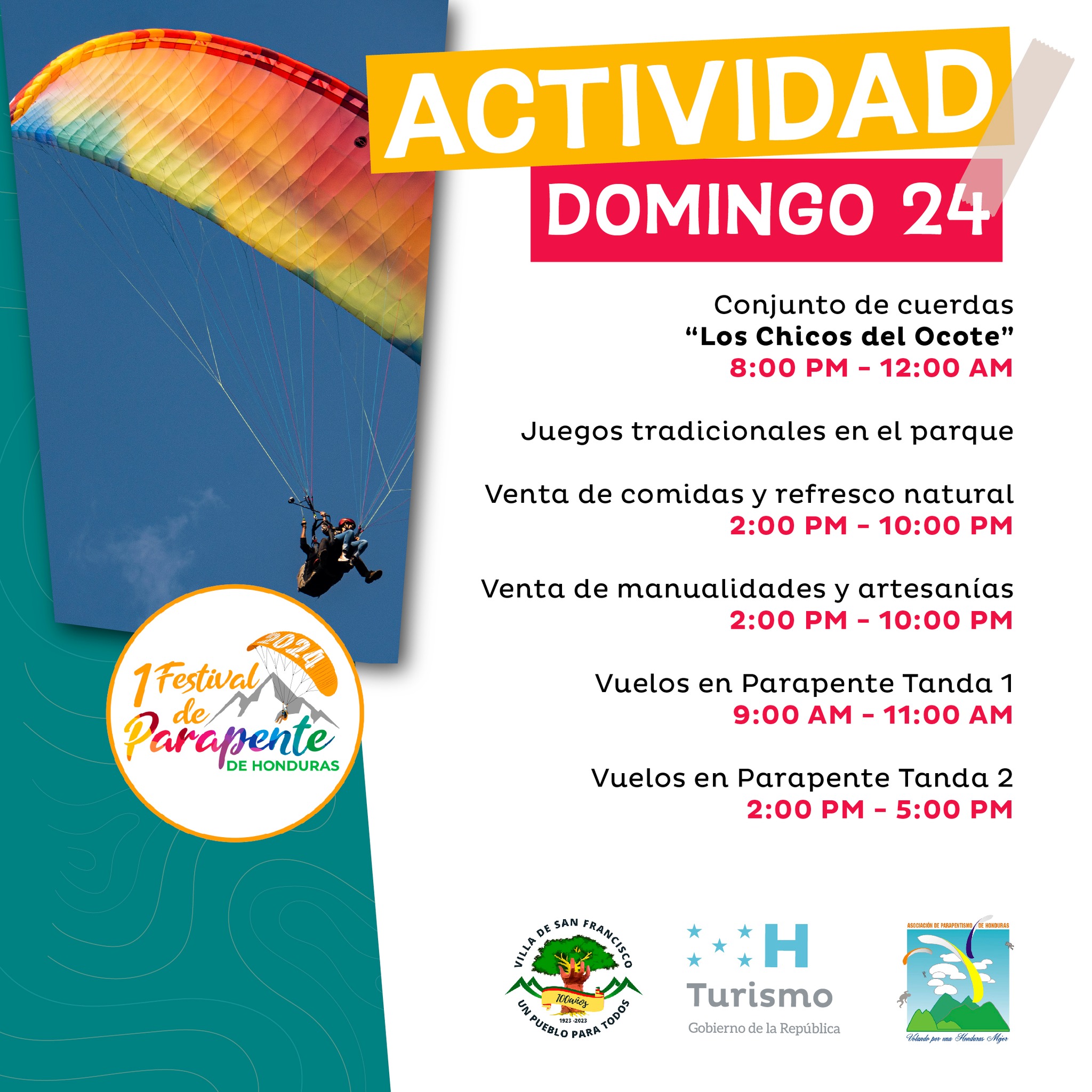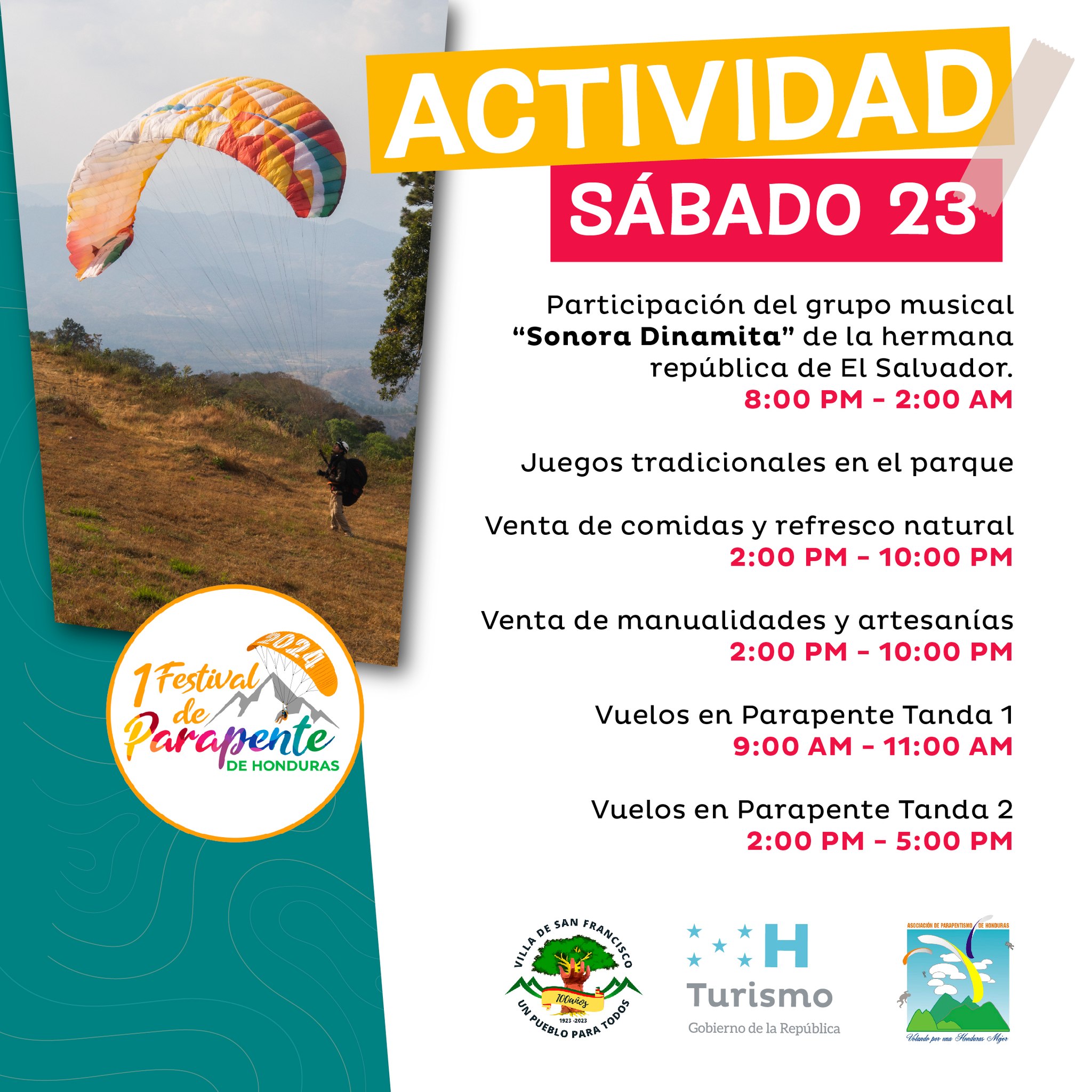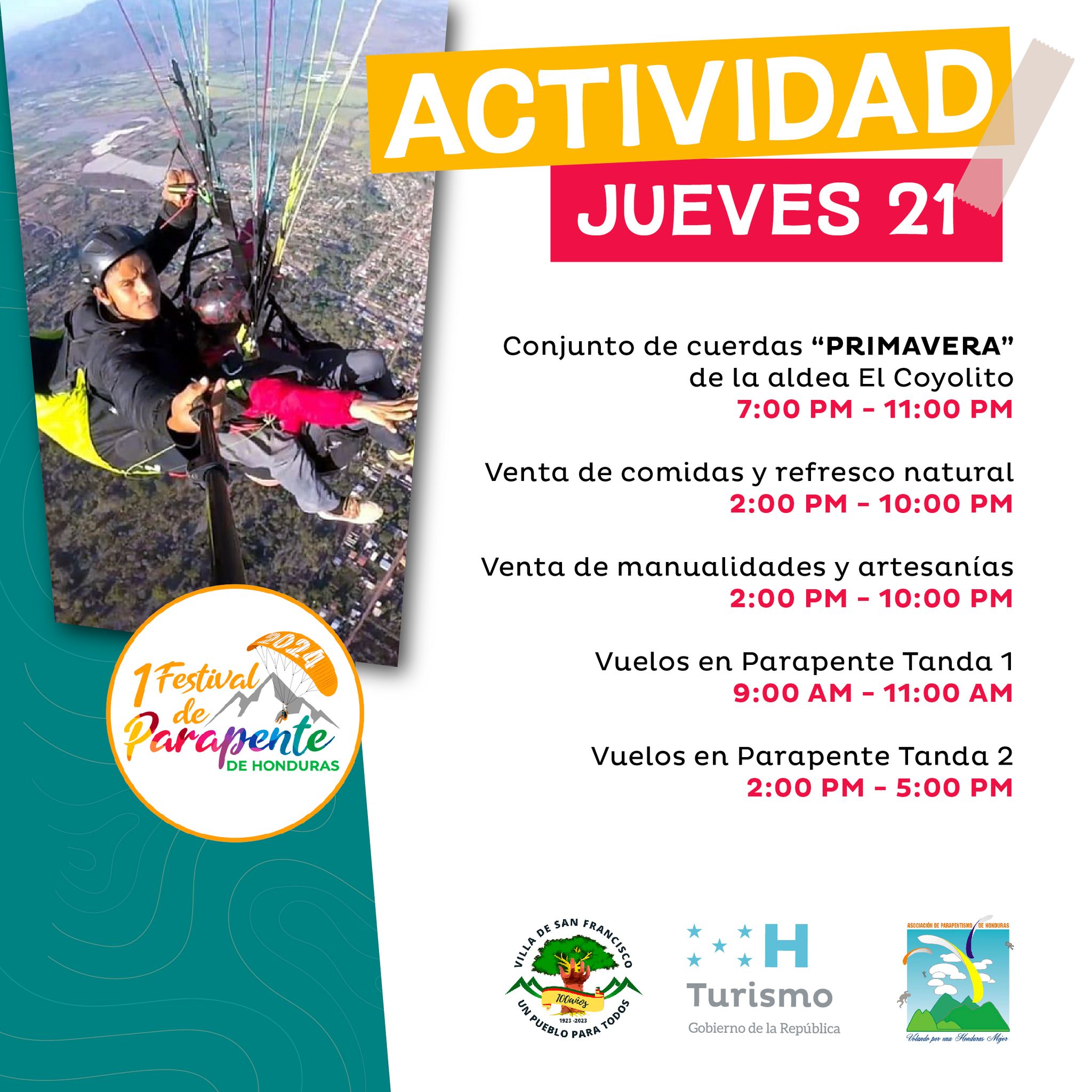 Participa del primer Festival de Parapente de Honduras, el cual se estará desarrollando de 21 al 24 de marzo de 2024 en la Villa de San Francisco la cual encontraras rica gastronomía, artesanías, grupo teatral, banda municipal y vuelos en parapente.