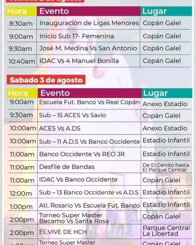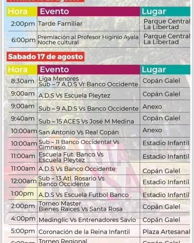 Programación de la feria de Santa Rosa de Copán Fecha de Inicio Viernes, Agosto 2, 2024 - 12:00 AM Sábado, Agosto 3, 2024 - 12:00 AM Domingo, Agosto 4, 2024 - 12:00 AM Sábado, Agosto 10, 2024 - 12:00 AM Domingo, Agosto 11, 2024 - 12:00 AM Martes, Agosto 13, 2024 - 12:00 AM Miércoles, Agosto 14, 2024 - 12:00 AM Jueves, Agosto 15, 2024 - 12:00 AM Viernes, Agosto 16, 2024 - 12:00 AM Sábado, Agosto 17, 2024 - 12:00 AM Domingo, Agosto 18, 2024 - 12:00 AM Jueves, Agosto 22, 2024 - 12:00 AM Sábado, Agosto 24, 2024 - 12:00 AM Domingo, Agosto 25, 2024 - 12:00 AM Martes, Agosto 27, 2024 - 12:00 AM Jueves, Agosto 29, 2024 - 12:00 AM Viernes, Agosto 30, 2024 - 12:00 AM Sábado, Agosto 31, 2024 - 12:00 AM Cultura y Patrimonio Les compartimos la programación de la feria de Santa Rosa de Copán para que puedas disfrutar con tu familia.