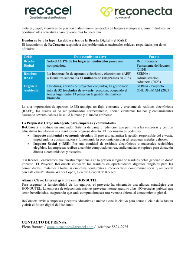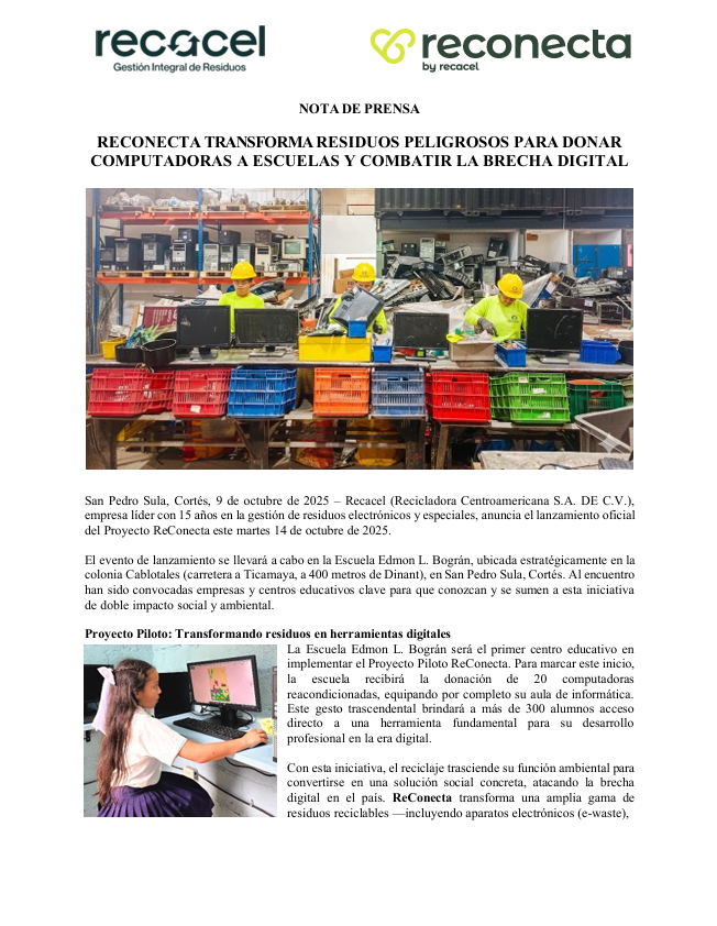 RECONECTA de Recacel transforma residuos peligrosos para donar computadoras a escuelas y combatir la brecha digital Fecha de Inicio Martes, Octubre 14, 2025 - 12:00 AM Conferencia de prensa RECONECTA de Recacel transforma residuos peligrosos para donar computadoras a escuelas y combatir la brecha digital