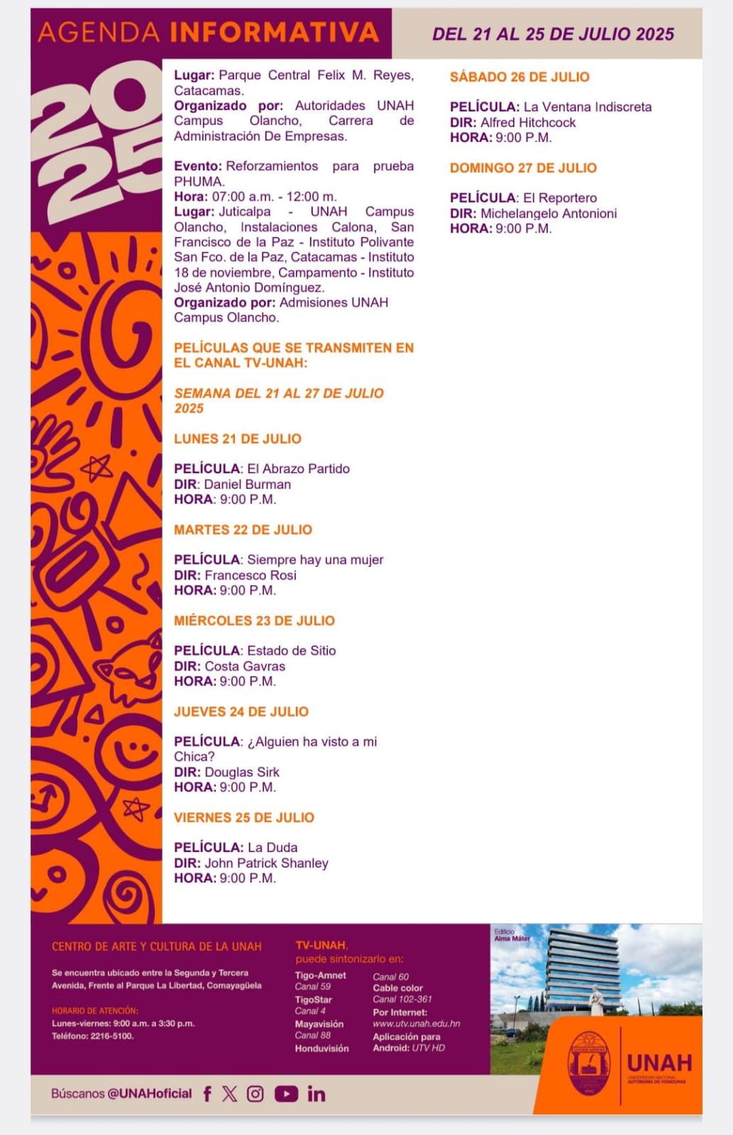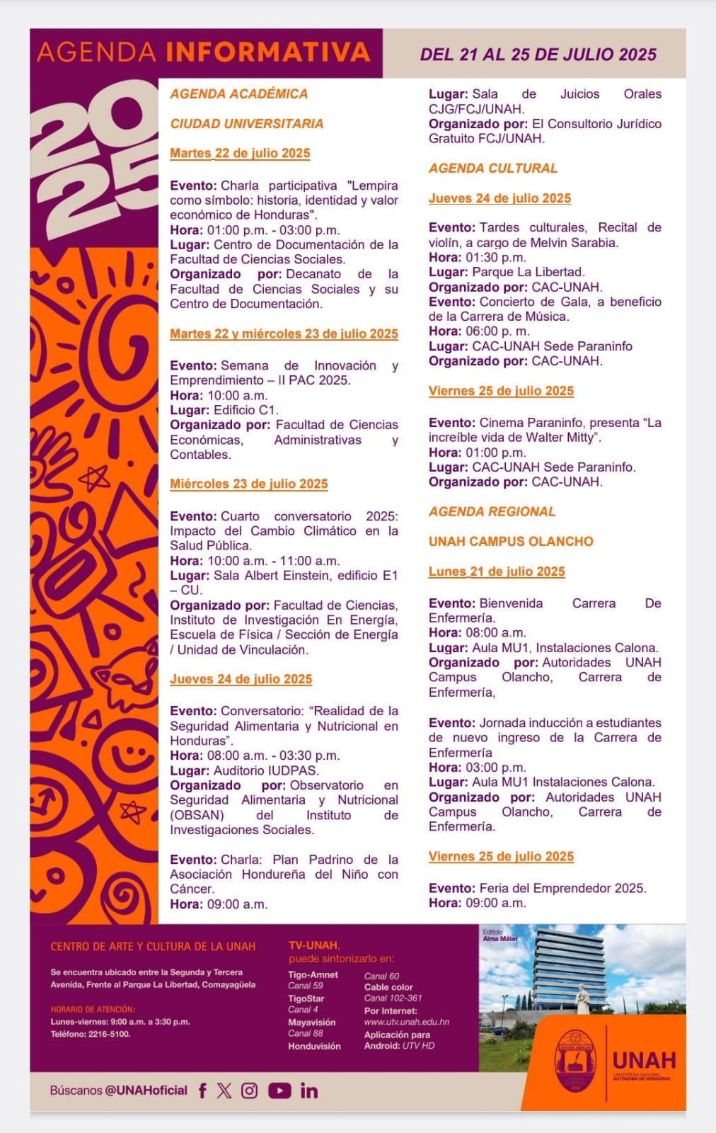 UNAH Agenda Académica Fecha de Inicio Lunes, July 21, 2025 - 12:00 AM Martes, July 22, 2025 - 12:00 AM Miércoles, July 23, 2025 - 12:00 AM Jueves, July 24, 2025 - 12:00 AM Viernes, July 25, 2025 - 12:00 AM Conferencia de prensa UNAH Agenda Académica