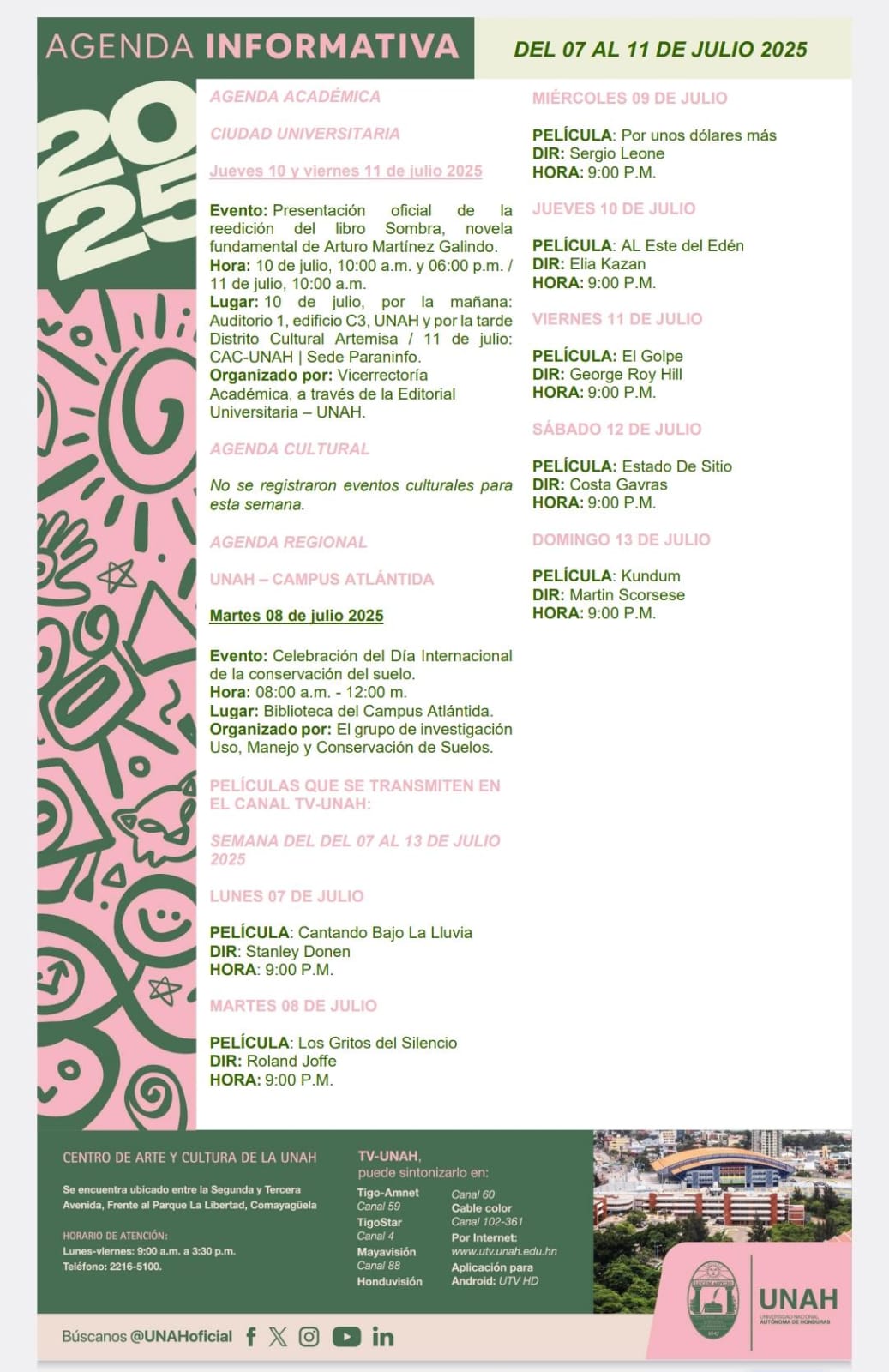 UNAH: Agenda Académica Semanal Fecha de Inicio Lunes, July 7, 2025 - 12:00 AM Martes, July 8, 2025 - 12:00 AM Miércoles, July 9, 2025 - 12:00 AM Jueves, July 10, 2025 - 12:00 AM Viernes, July 11, 2025 - 12:00 AM Conferencia de prensa UNAH: Agenda Académica Semanal