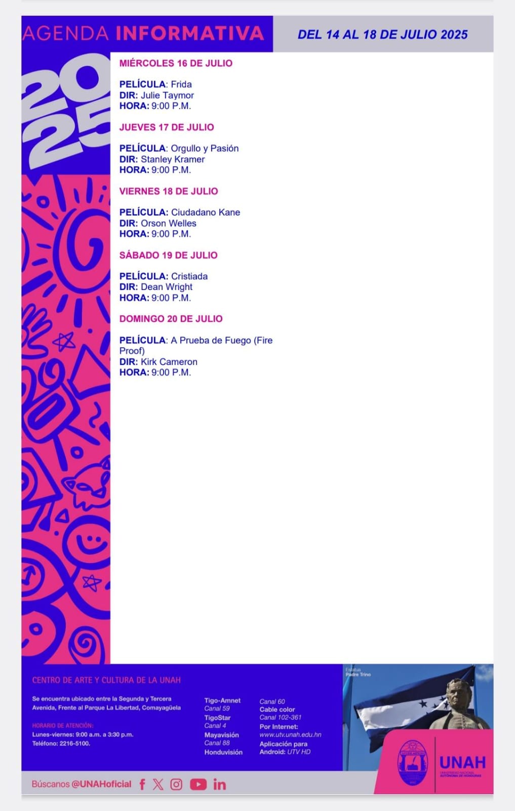UNAH: Agenda de Actividades Fecha de Inicio Lunes, July 14, 2025 - 12:00 AM Martes, July 15, 2025 - 12:00 AM Miércoles, July 16, 2025 - 12:00 AM Jueves, July 17, 2025 - 12:00 AM Viernes, July 18, 2025 - 12:00 AM Conferencia de prensa UNAH: Agenda de Actividades
