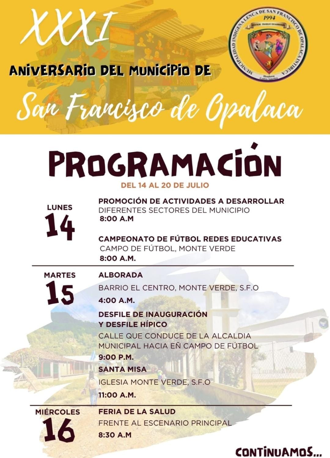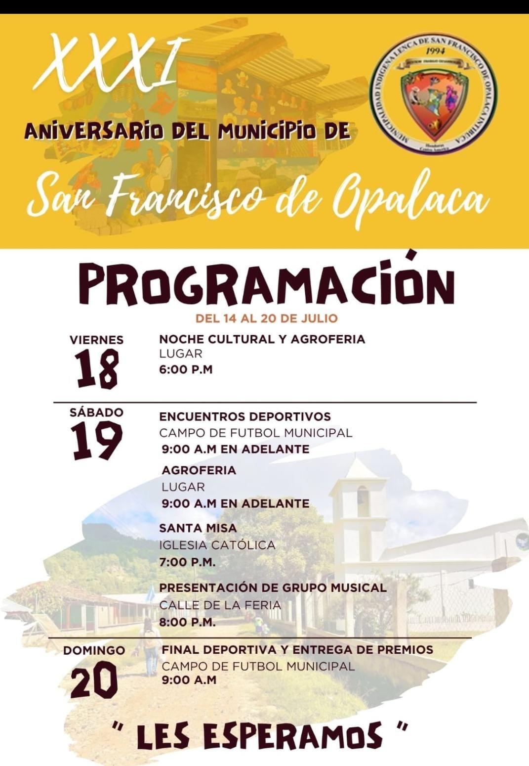 XXXI Aniversario del municipio de San Francisco de Opalaca, Intibucá Fecha de Inicio Lunes, July 14, 2025 - 12:00 AM Martes, July 15, 2025 - 12:00 AM Miércoles, July 16, 2025 - 12:00 AM Viernes, July 18, 2025 - 12:00 AM Sábado, July 19, 2025 - 12:00 AM Domingo, July 20, 2025 - 12:00 AM Cultura y Patrimonio XXXI Aniversario del municipio de San Francisco de Opalaca, Intibucá